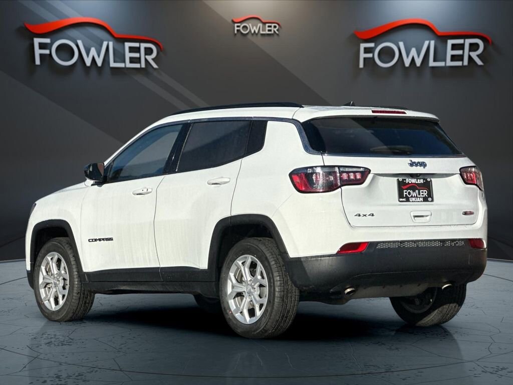 Bright White Clearcoat 2024 Jeep Compass Latitude 4WD 8-Speed Automatic 2.0L I4 DOHC 4WD, 17 x 7 Aluminum Wheels, 3.73 Final Drive Ratio, 4-Wheel Disc Brakes, 6 Speakers, ABS brakes, Air Conditioning, Alloy wheels, AM/FM radio: SiriusXM, Auto High-beam Headlights, Brake assist, Bumpers: body-color, Compass, Delay-off headlights, Driver door bin, Driver vanity mirror, Dual front impact airbags, Dual front side impact airbags, Electronic Stability Control, Emergency communication system: Jeep Connect, Four wheel independent suspension, Front anti-roll bar, Front Bucket Seats, Front Center Armrest w/Storage, Front fog lights, Front License Plate Bracket, Front reading lights, Fully automatic headlights, Heated door mirrors, Illuminated entry, Knee airbag, Leather Shift Knob, Leather steering wheel, Low tire pressure warning, Occupant sensing airbag, Outside temperature display, Overhead airbag, Overhead console, Panic alarm, ParkView Rear Back-Up Camera, Passenger door bin, Passenger vanity mirror, Power door mirrors, Power steering, Power windows, Premium Cloth/Vinyl Bucket Seats, Quick Order Package 29J Latitude, Radio: Uconnect 5 w/10.1 Display, Rear anti-roll bar, Rear seat center armrest, Rear window defroster, Rear window wiper, Remote keyless entry, Security system, Speed control, Split folding rear seat, Spoiler, Steering wheel mounted audio controls, Tachometer, Telescoping steering wheel, Tilt steering wheel, Traction control, Trip computer, Variably intermittent wipers, 4WD.