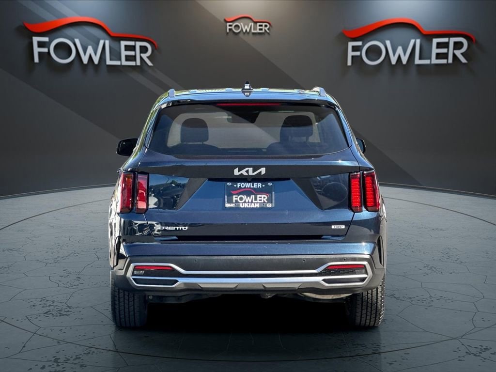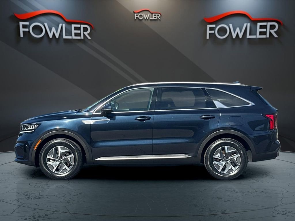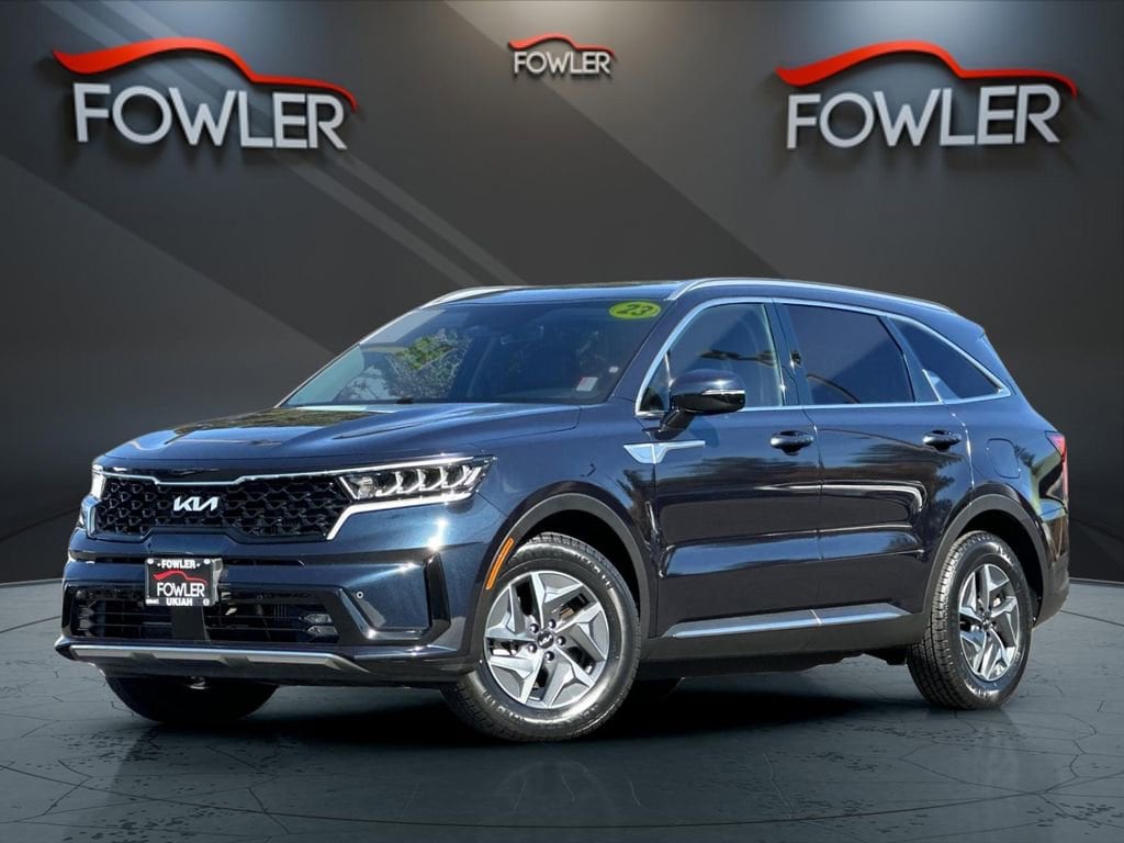 Gravity Blue 2023 Kia Sorento Hybrid EX FWD 6-Speed Automatic 1.6L I4 DGI Hybrid Turbocharged DOHC 16V LEV3-ULEV70 1.6L I4 DGI Hybrid Turbocharged DOHC 16V LEV3-ULEV70, 3rd row seats: split-bench, 4-Wheel Disc Brakes, 6 Speakers, ABS brakes, Air Conditioning, Alloy wheels, AM/FM radio: SiriusXM, Apple CarPlay & Android Auto, Auto High-beam Headlights, Automatic temperature control, Axle Ratio: 3.510, Brake assist, Bumpers: body-color, Cargo Net, Carpet Floor Mats, Delay-off headlights, Driver door bin, Driver vanity mirror, Dual front impact airbags, Dual front side impact airbags, Electronic Stability Control, Emergency communication system, Exterior Parking Camera Rear, Four wheel independent suspension, Front anti-roll bar, Front Bucket Seats, Front Center Armrest, Front dual zone A/C, Front fog lights, Front reading lights, Fully automatic headlights, Heated door mirrors, Heated Front Bucket Seats, Heated front seats, Illuminated entry, Knee airbag, Leather steering wheel, Low tire pressure warning, Navigation System, Occupant sensing airbag, Outside temperature display, Overhead airbag, Overhead console, Panic alarm, Passenger door bin, Passenger vanity mirror, Power door mirrors, Power driver seat, Power Liftgate, Power passenger seat, Power steering, Power windows, Radio data system, Radio: AM/FM/HD Radio/SiriusXM Audio System, Rear air conditioning, Rear anti-roll bar, Rear reading lights, Rear window defroster, Rear window wiper, Remote keyless entry, Roof rack: rails only, Security system, Smart Key w/ Push Button and Remote Start, Speed control, Speed-sensing steering, Split folding rear seat, Spoiler, Steering wheel mounted audio controls, SynTex Artificial Leather Seat Trim, Tachometer, Telescoping steering wheel, Tilt steering wheel, Traction control, Trip computer, Turn signal indicator mirrors, Variably intermittent wipers, Wheels: 7.0J x 17 Machine-Finished Aero Alloy, 1.6L I4 DGI Hybrid Turbocharged DOHC 16V LEV3-ULEV70.