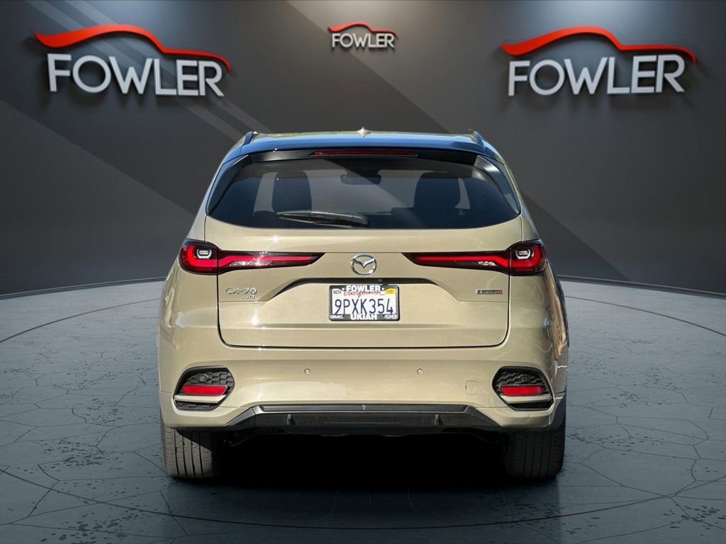Certified. Zircon Sand Metallic 2025 Mazda CX-70 3.3 Turbo S Premium AWD 8-Speed Automatic I6 Turbo Mazda Certified Pre-Owned Certified, 12 Speakers, 4-Wheel Disc Brakes, ABS brakes, Air Conditioning, Alloy wheels, AM/FM radio: SiriusXM, Auto High-beam Headlights, Auto-dimming door mirrors, Auto-dimming Rear-View mirror, Automatic temperature control, Brake assist, Bumpers: body-color, Compass, Delay-off headlights, Driver door bin, Driver vanity mirror, Dual front impact airbags, Dual front side impact airbags, E911 Automatic Emergency Notification, Electronic Stability Control, Emergency communication system: MAZDA CONNECT, Four wheel independent suspension, Front anti-roll bar, Front Bucket Seats, Front Center Armrest w/Storage, Front dual zone A/C, Front reading lights, Fully automatic headlights, Garage door transmitter: HomeLink, Heads-Up Display, Heated door mirrors, Heated front seats, Heated rear seats, Heated steering wheel, Heated/Ventilated Front Bucket Seats, Illuminated entry, Infotainment System Voice Command, Knee airbag, Leather Shift Knob, Leather steering wheel, Low tire pressure warning, Mazda Connected Services, Mazda Online Navigation, Memory seat, Nappa Leather Seat Trim, Navigation system: MAZDA CONNECT, Occupant sensing airbag, Outside temperature display, Overhead airbag, Overhead console, Pandora Internet Radio Integration, Panic alarm, Passenger door bin, Passenger vanity mirror, Power door mirrors, Power driver seat, Power Liftgate, Power moonroof, Power passenger seat, Power steering, Power windows, Radio Broadcast Data System Program Information, Radio data system, Radio: AM/FM w/Bose Premium Audio Sound System, Rain sensing wipers, Rear air conditioning, Rear anti-roll bar, Rear reading lights, Rear seat center armrest, Rear window defroster, Rear window wiper, Remote keyless entry, Security system, SMS Text Msg Audio Delivery & Reply, Speed control, Speed-sensing steering, Split folding rear seat, Spoiler, Steering wheel memory, Steering wheel mounted audio controls, Tachometer, Telescoping steering wheel, Tilt steering wheel, Traction control, Trip computer, Turn signal indicator mirrors, Variably intermittent wipers, Ventilated front seats, Wheels: 21 x 9.5J Aluminum Alloy, Zircon Sand Metallic Paint Charge.